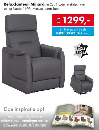 De prijs van de Relaxfauteuil Minardi kan ook teruggevonden worden hierboven op de pagina, samen met de datum van wanneer de aanbieding beschikbaar is. Ook kun je de prijzen in de huidige Woonsquare Slaapfolder of op de Woonsquare website controleren. De aanbiedingen verzekeren je van het kopen van de Woonsquare producten voor de laagste prijs.