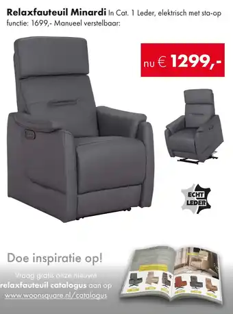 De prijs van de Relaxfauteuil Minardi kan ook teruggevonden worden hierboven op de pagina, samen met de datum van wanneer de aanbieding beschikbaar is. Ook kun je de prijzen in de huidige Woonsquare folder of op de Woonsquare website controleren. De aanbiedingen verzekeren je van het kopen van de Woonsquare producten voor de laagste prijs.