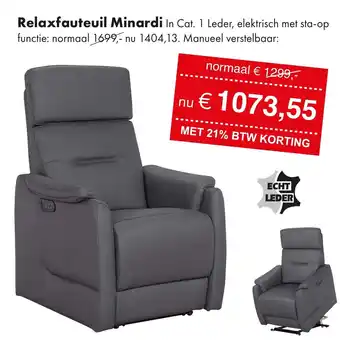 De Relaxfauteuil Minardi is nu verkrijgbaar in echt leder met elektrische sta-op functie. Normaal kost deze fauteuil 1699,- maar nu met 21% BTW korting voor slechts 1404,13. De fauteuil is handmatig verstelbaar en van hoge kwaliteit. Met zijn comfortabele zitting en luxe uitstraling is de Minardi de perfecte toevoeging aan jouw interieur. Of je nu wilt relaxen na een lange dag werken of gewoon lekker wilt zitten, deze fauteuil biedt de ultieme ontspanning. Profiteer nu van deze aanbieding en geniet van het comfort en de stijl die de Relaxfauteuil Minardi te bieden heeft. Bestel hem vandaag nog en ervaar zelf het verschil!