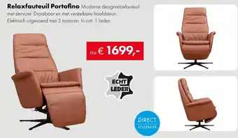 De Relaxfauteuil Portofino is een moderne designrelaxfauteuil met stervoet, draaibaar en voorzien van een verstelbare hoofdsteun. Deze elektrisch uitgevoerde fauteuil heeft 3 motoren en is verkrijgbaar in categorie 1 echt leder. Het leder is direct leverbaar, waardoor je snel kunt genieten van ultiem comfort en ontspanning. De Portofino is niet alleen een eyecatcher in je interieur, maar biedt ook optimale ondersteuning en comfort. Of je nu wilt relaxen na een lange dag werken of gewoon lekker wilt ontspannen met een goed boek, deze relaxfauteuil is de perfecte keuze. Met zijn strakke lijnen en hoogwaardige afwerking past de Portofino in elk eigentijds interieur. Haal deze luxe fauteuil vandaag nog in huis en geniet van ultieme ontspanning!