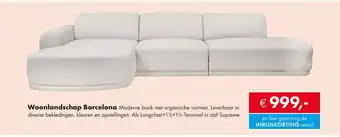 Het Woonlandschap Barcelona is een eigentijdse bank met organische vormen, perfect voor een moderne inrichting. Deze bank is leverbaar in diverse bekledingen, kleuren en opstellingen, waardoor je hem helemaal naar jouw wensen kunt samenstellen. De Longchair+1+1½-Terminal in stof Supreme is verkrijgbaar voor slechts € 999,-, en daar komt nog de INRUILKORTING bovenop. Met zijn strakke lijnen en comfortabele zitvlakken is de Barcelona een echte eyecatcher in elke woonkamer. Of je nu van een minimalistische stijl houdt of juist van een meer uitgesproken interieur, deze bank past zich moeiteloos aan. Creëer jouw ideale woonlandschap met de Barcelona bank en geniet van stijlvol en comfortabel wonen.