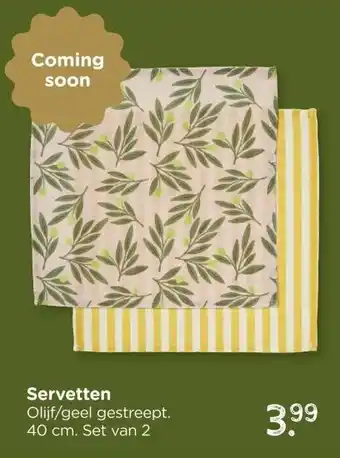 De aanbieding is verkrijgbaar in verschillende winkels, bekijk alle producten om de goedkoopste Servetten te krijgen. Als je graag wilt kijken of het artikel met meer korting te koop is in een andere winkel, bekijk de categorie 'Wonen'. Wellicht vind je deze aanbiedingen ook interessant: Servetten, Servetten olijf & Dunilin Servetten.