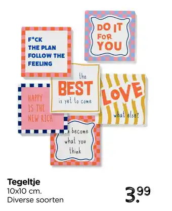 De aanbieding is verkrijgbaar in verschillende winkels, bekijk alle producten om de goedkoopste Tegeltje te krijgen. Als je graag wilt kijken of het artikel met meer korting te koop is in een andere winkel, bekijk de categorie 'Wonen'. Wellicht vind je deze aanbiedingen ook interessant: undefined[link], undefined[link] & undefined[link].