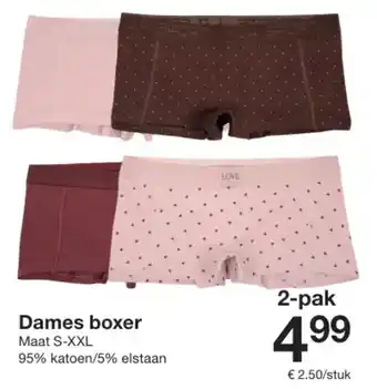 De prijs van de Dames boxer kan ook teruggevonden worden hierboven op de pagina, samen met de datum van wanneer de aanbieding beschikbaar is. Ook kun je de prijzen in de huidige Zeeman folder of op de Zeeman website controleren. De aanbiedingen verzekeren je van het kopen van de Zeeman producten voor de laagste prijs.