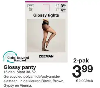 Deze glanzende panty's van ZEEMAN zijn een must-have voor elke vrouw! Het 2-pack bevat panty's met een glossy finish in de kleuren Black, Brown, Gypsy en Vienna. De panty's hebben een dikte van 15 denier en zijn gemaakt van gerecycled polyamide, polyamide en elastaan volgens de Global Recycled Standard. Ze zijn verkrijgbaar in maat 38-52 en zitten comfortabel dankzij de stretchy stof. De panty's zijn perfect voor onder een jurk of rok en geven je benen een elegante uitstraling. Voor slechts €2.00 per stuk heb je al een set van twee panty's in huis. Upgrade je outfit met deze Glossy tights van ZEEMAN en straal de hele dag door!